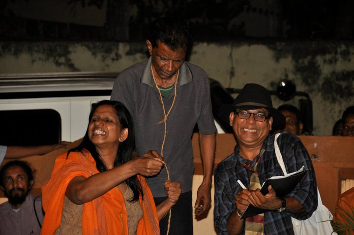 The piece opened with actors representing western superpowers devouring food like animals and then gradually eating with more and more decorum but no less rapacious appetites. Then came the hungry delegate from Bangladesh, begging with his hat; he only got the discarded chicken bones and the leftovers from the wealthy nations. Meanwhile representatives of the powerful countries – still engrossed in their sumptuous meal – decided that the solution to the world food and population problem resided in a pill: a pill to be given to the developing nations. The performance ended with all the performers crying in unison in a rhythmic chant to the accompaniment of drums, “food for them, pills for us. Food for them, pills for us.” As the performance unfolded there was an uncomfortable realization on the part of the conference attendees that the performance they were witnessing was in fact about them. In his recollection of the event, Gamini Haththotuwegama, who led the Wayside and Open Theatre for more than three decades, characterized the audience reaction as one of silence, discomfort, and anger. The group had managed to break into the comfortable space of the powerful representatives of the organization and subvert it from within, calling the entire situation into question as well as highlighting its inherent performativity.